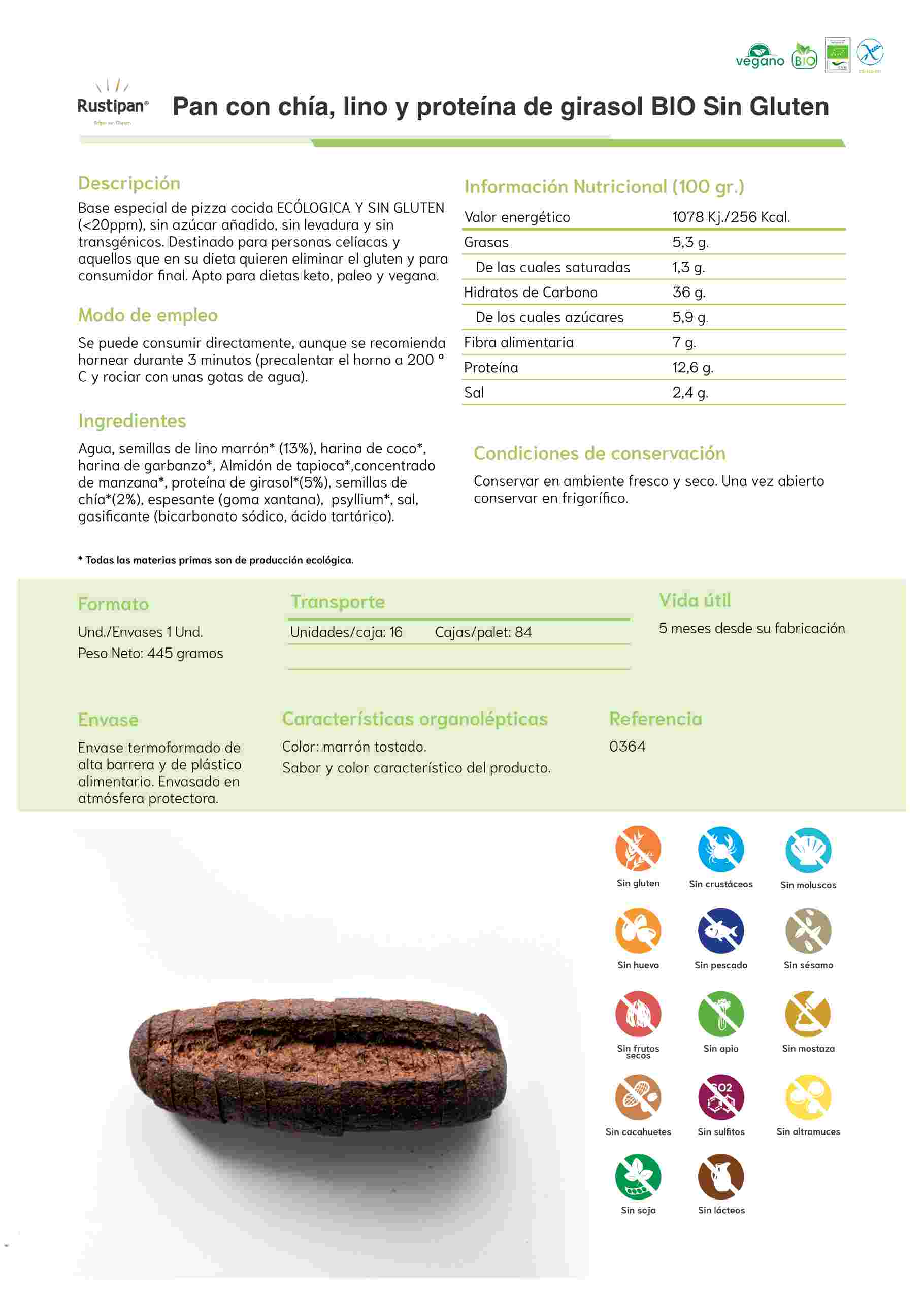 Pan ECOLÓGICO y SIN GLUTEN (<20 ppm), sin transgénicos, sin azúcares añadidos, sin levadura y libre de alérgenos (huevo, leche, soja, frutos secos), según el Reg. 1169/2011 (ver tabla de alérgenos). Destinados para personas celíacas, aquellas que quieran eliminar de su dieta el gluten y para consumidor final. Apto para dietas keto, paleo, vegetariana y vegana.
